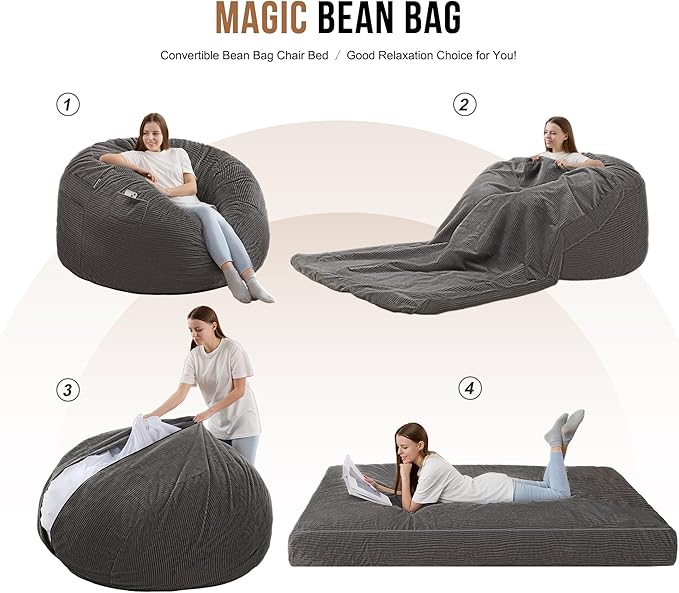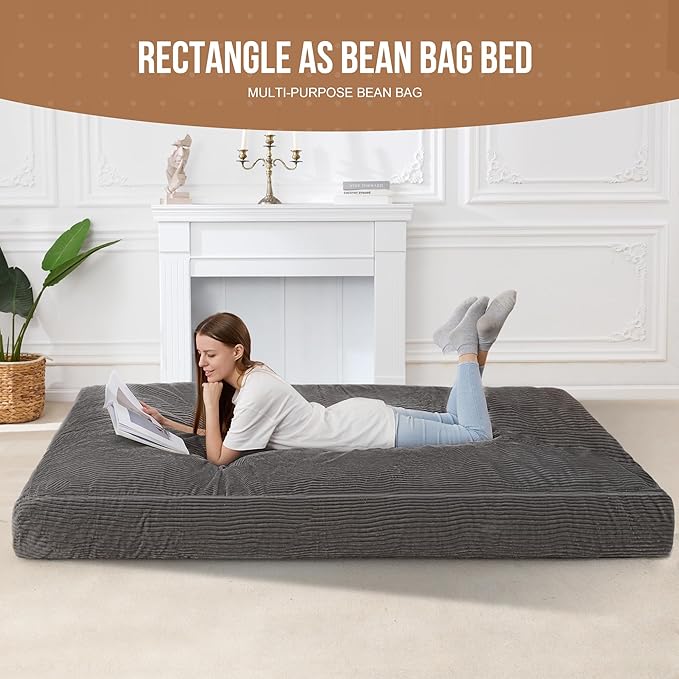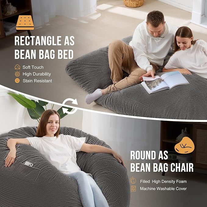 Homguava Corduroy Bean Bag Chair, Variable Shape from Bean Bag to Matress, Convertible Beanbag Chair for Home, Living Room(Grey, Queen)
