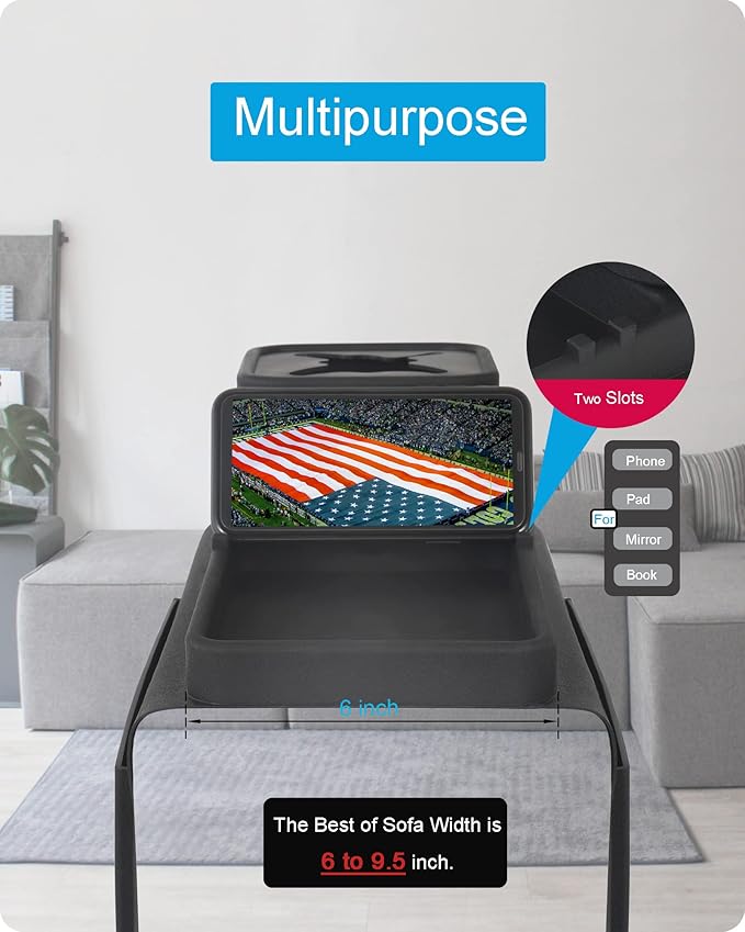 - ✅ LARGER SIZE, LARGER CUP HOLDER, LARGER TRAY: This couch tray has upgraded size and silicone material to fit sofas with 9.5inch wide armrests. The wider tray (6in) can easily hold your cell phones, ipad, remote controls, earbuds or snacks. Cup holder also increased the size and depth (3.5in), can hold multiple cup sizes, including handles on mugs.