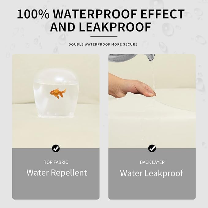 - 100% Waterproof Fabric: Top Fabric is processed with waterproof treatment, and back coated with waterproof layer. Dual waterproof feature can guarantee 100% waterproof effect and leakproof. elastane +polyester, back coated with TPU film. The couch cover is a great choice for homes with children and pets.