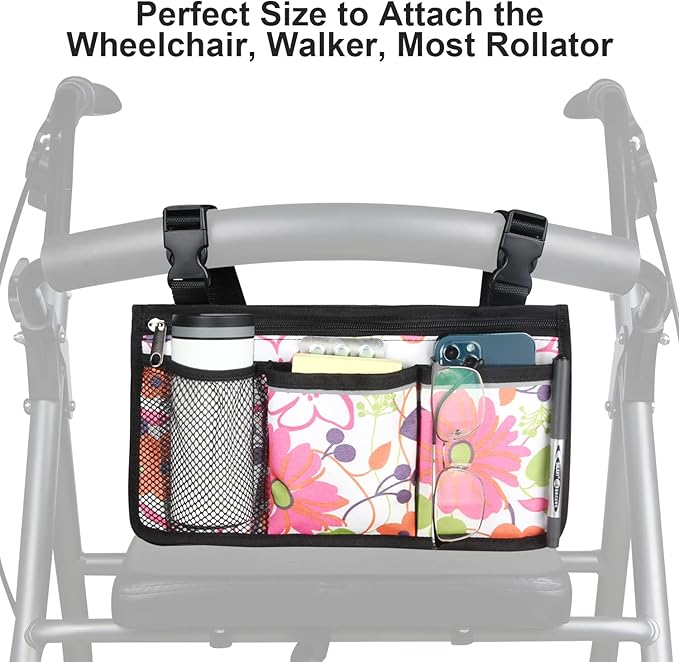Wheelchair Side Bag, Upgrade Flower Color Wheelchair Armrest Storage Pouch with Cup Holder and Reflective Strip Made with Waterproof Fabric, for Most Wheelchairs, Walkers and Rollators (Pink Floral)