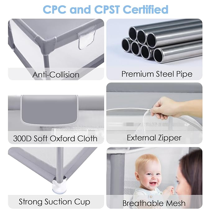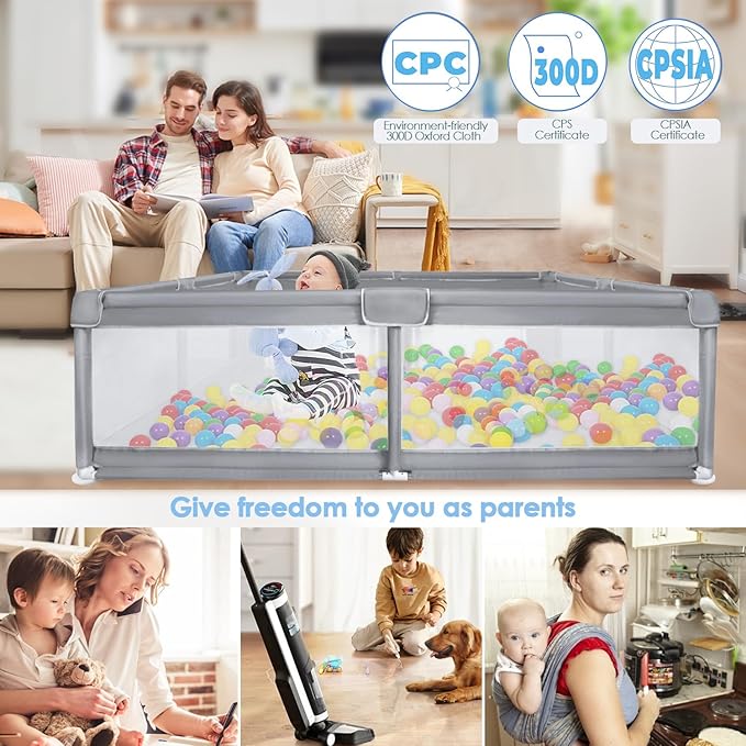 - ✨[Spacious Baby's Safe Playground]: Playard for babies and toddlers measures 79x59x26 inches, with enough room to hold a lot of toys, and adults. The corners and pipes are made of thickened sponge to protect the child's head from collisions, and the internal stainless steel pipe can withstand a pressure of 30 kg. There are 4 suction cup devices at the bottom with super suction Ensure that the fence will not tip over and move. Baby playpen large baby play yards indoor baby playpen for toddler