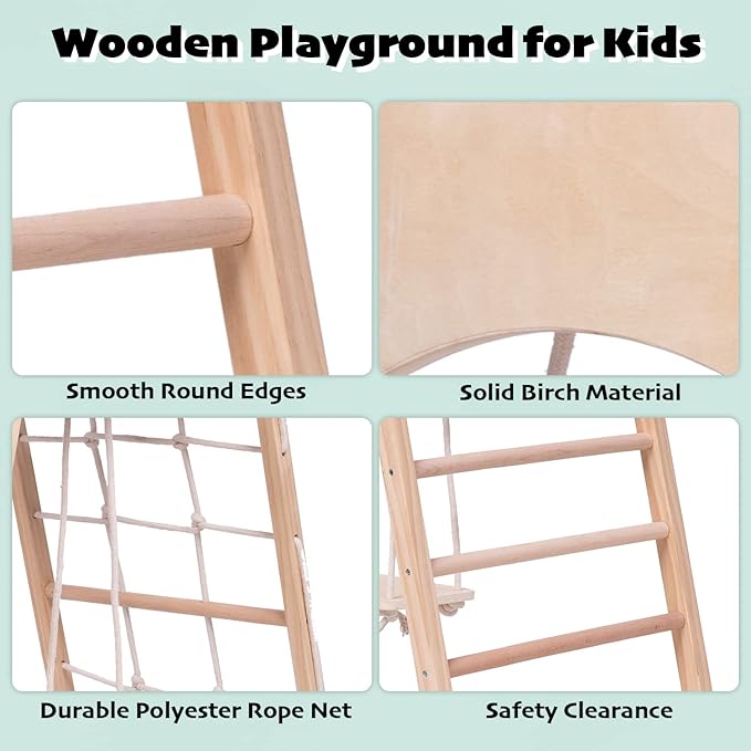 - 【Scientific and Practical】: Under the scientific structural design and functional combination, all the play functions of this set of wooden playsets can help children better develop physical coordination and physical vitality, and can also help them develop synergy when playing with their friends, is an indispensable set of comprehensive equipment in excellent family education.