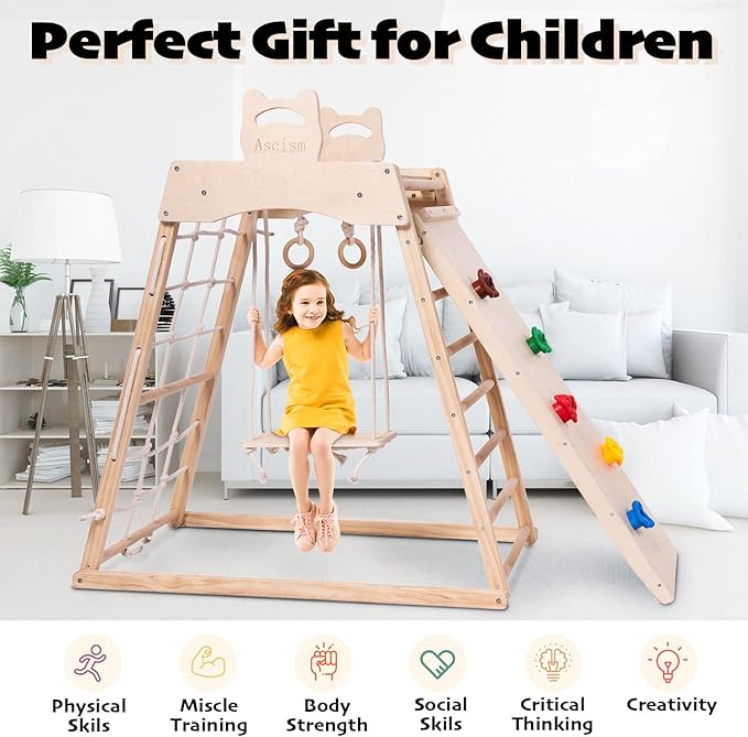 - 【8 in 1 Multifunction】With mini rope climbing net, Swedish slide,hanging rings(gymnastics), wood ladder & swing/Tent ect, offering endless fun for children to play, Secondly, It can give kids the experience of climbing, sliding, painting, and calculations. Not only can it help kids promote gross motor skills, physical coordination, balance ability, and brain development, but it also can strengthen children's balance control ability, and help children to improve their courage.