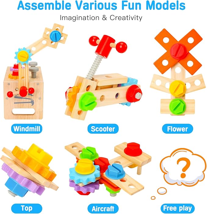 - 【Great Educational Construction Toys】The wooden toy tools can be assembled into a variety of interesting figures, such as flowers, windmills, and scooter. It arouses kids’ imagination and creativity, and improve their logical thinking skills. Also toddler tool set encourages kids to study construction knowledge and develop interests in construction. Ideal educational toys for 3 year old, and preschool learning activities age 3.