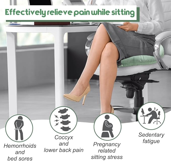 - Safe & Healthy Sitting - The seat pillow helps relieve pressure from your back or pelvic region while sitting for extended periods, also an ideal solution for people suffering from hemorrhoids, bed sores, broken tailbones, sciatica, coccyx pain, during pregnancies or post injuries.