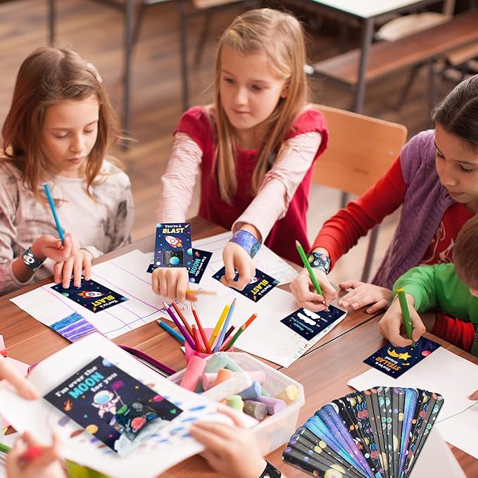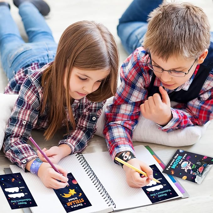 - Outer Space Theme: The package contains 28 Slap Bracelets and 28 Valentine's Day cards. The entire set is designed with an outer space theme, such as astronauts, various planets, rockets, flying saucers, solar system and other elements. 28 bracelets have 10 different styles of design, two of each style, the remaining 8 bracelets will be shipped randomly. Enough quantity and a variety of styles to meet the imagination of people in space, creating a mysterious and romantic atmosphere.