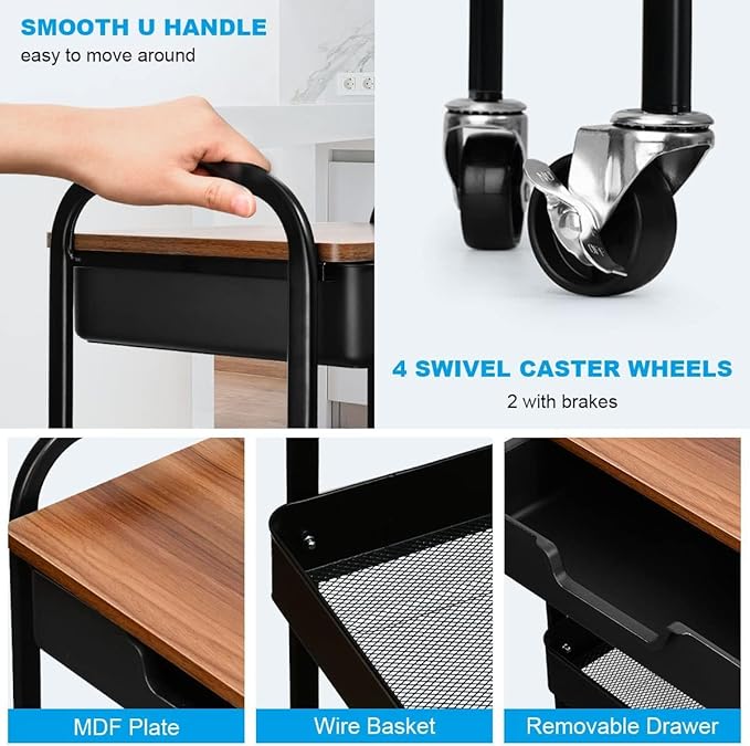 - Strong & Sturdy:Except plastic drawer and wooden board,The Material of storage cart is made of high quality carbon steel,The rugged construction allows the 3 tier rolling cart with handle to support up to 200lbs of weight.The rolling utility cart is well-constructed, sturdy, durable to use for many years.