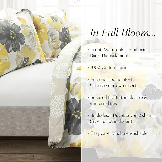 - Bold Florals: Add energy to your bedroom with the floral design of our Leah Reversible Cotton Duvet Cover Set. The various shades of yellow and gray in a pattern of large blooming flowers is sure to brighten your space with the feeling of spring.