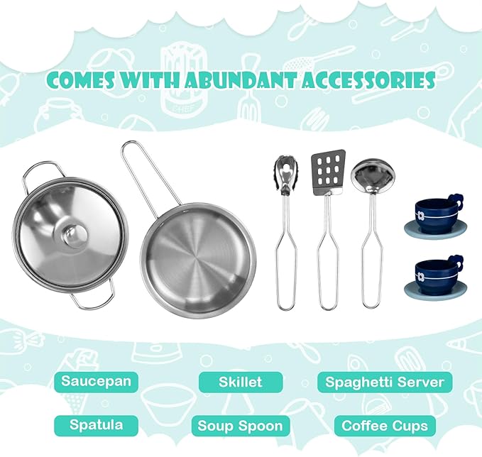 - 【Lots of Accessories for Added Fun】The pretend kitchen set comes with plenty of cooking supplies, including 1 saucepan, 1 skillet, 1 spaghetti server, 1 spatula, 1 soup spoon and 2 coffee cups, allowing kids to prepare food with ease. And the hanging hooks keep culinary equipment within arm’s reach. With a storage stool, kids can sit comfortably while playing.