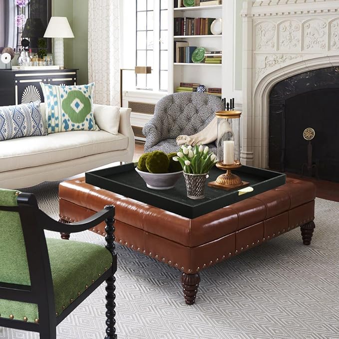 - Oversized faux leather serving tray for serving your favorite foods and beverages atop your ottoman or coffee table; Boasts an ample serving area with high sides and cutout handles; Ribbed base is an attractive accent that inhibits items from sliding around.