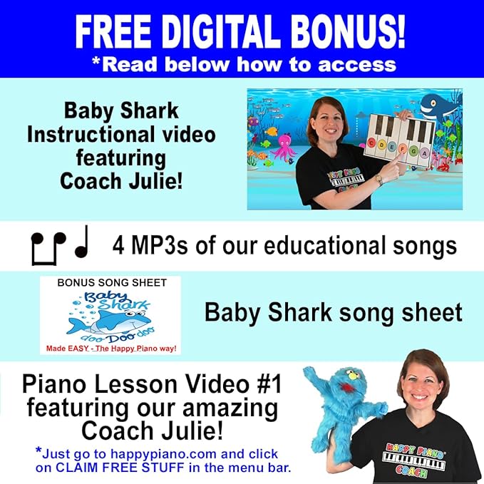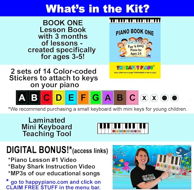 - KIT INCLUDES: piano lesson book w/ 3 mos of lessons, 3 sets of 14 coding piano keyboard stickers (each set has 10 color stickers and 4 unique black stickers (to follow our innovative teaching system - to attach to your piano), AND ongoing support (via email, text or phone), PLUS - BONUS GIFT of digital products: BABY SHARK teaching video, Lesson One teaching video , MP3s of our amazing educational children's music. (FREE digital BOOK TWO upon completion - email us!) Previously only available in preschools, but now adapted for home use!