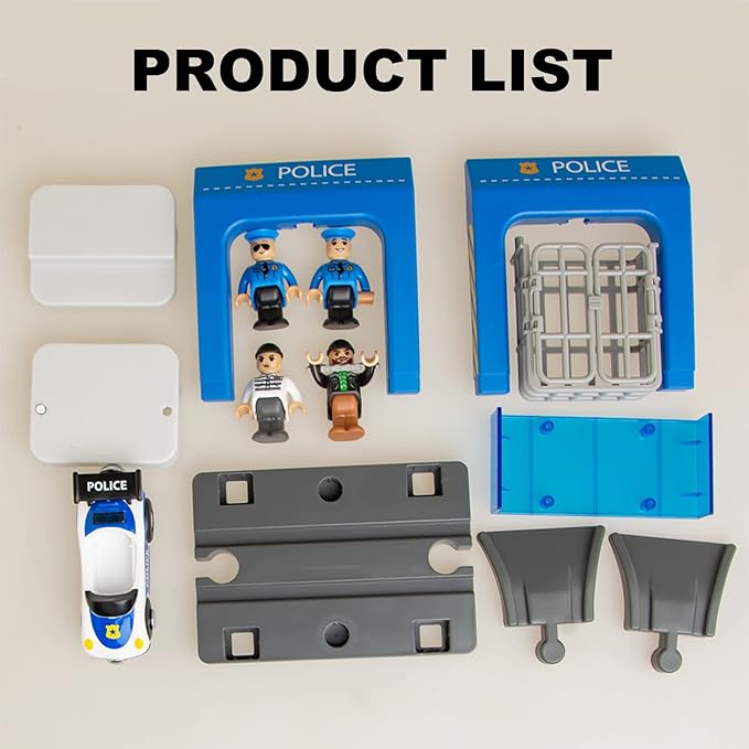 - PRODUCT INCLUDE - The Police Office Set for wooden train track comes with a prison, a police car, 4 action figures and a handcuff.Realistic scene, very suitable for kids to play role-playing games.
