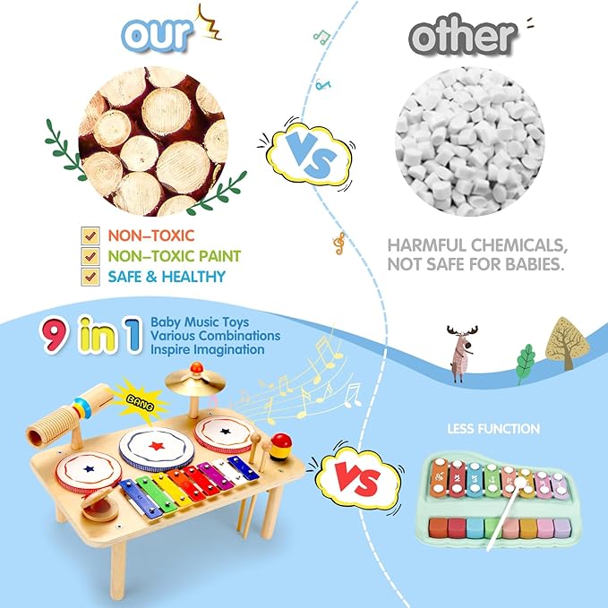 - TODDLER EDUCATION MUSICAL TOYS: This baby drum set is a good musical enlightenment toy that can stimulate children's creativity, motor skills and eye-hand coordination; let children escape the temptation from mobile phones and TV