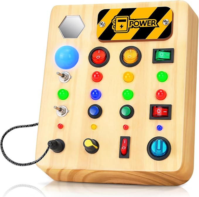 - Light Up Busy Board: Light up switch board toy includes 12 different coloured and sized lights + 12 buttons, knob switches, plugs and mirror