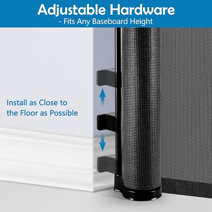 - Adjustable Hardware for Any Baseboard: No matter the height or style of your home's baseboards, our extra long baby gate comes with adjustable hardware, ensuring a seamless fit without the need for additional shims.
