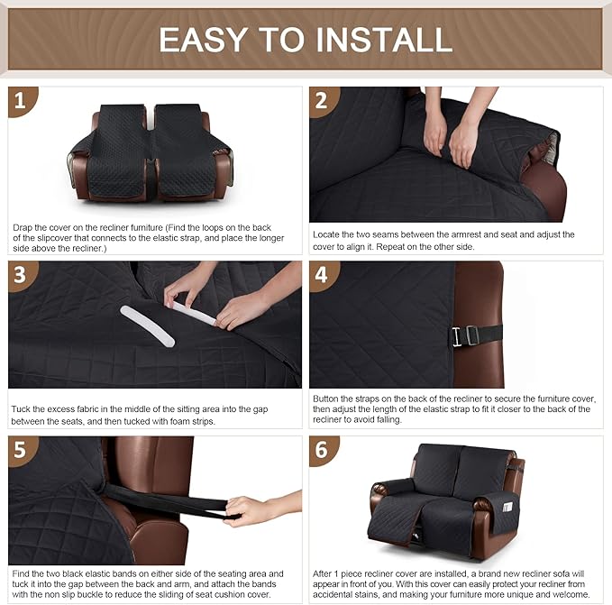 - Stay in Place Design: New upgraded non -slip large particles can reduce the sliding of the loveseat reclining cover, even on the leather sofa. Just drape the furniture with our loveseat recliner covers, tuck the excess fabric into the gap between the back and couch cushion. Then insert the foam stick into the gap. And use the elastic straps secure the slipcover stay in place firmly