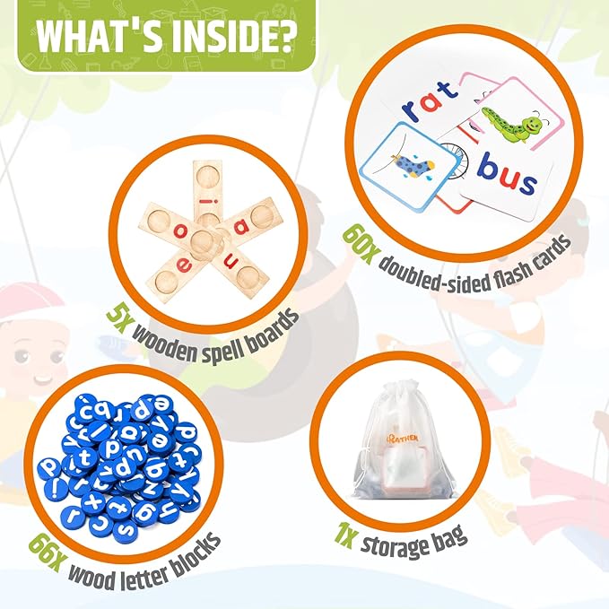 - 131-PIECE WODDEN SPELLING GAME:Comes with 66 pcs of wooden lowercase letter blocks, 60 CVC phonics word flashcards with picture illustrations, 5wooden spell boards in palm-size, and 1draw-string portable bag. More than 60 combinations of 3-letter-word, Fun learning toys for 3-5 year olds.