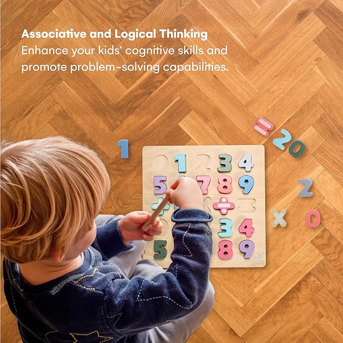 - ASSOCIATIVE AND LOGICAL THINKING: This wooden numbers puzzle for toddlers is designed to improve associative and logical thinking. It enhances concentration and patience, promoting cognitive and problem-solving skills. It's a perfect tool for number learning puzzle activities