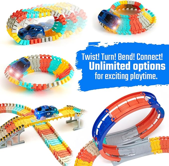 - 【Flexi-Tracks for Creative Racing】This car builder sets essentials pack is great for creative kids, with snap changeable, flex trackk , your kids can create twister spin races with gravity bending and epic turns! Set up on the table or zoom around furniture, you can even use other present brand racecars and vehicles on it too, making it a popular toddler car track for glow tracks racing cars and trains you've ever seen!