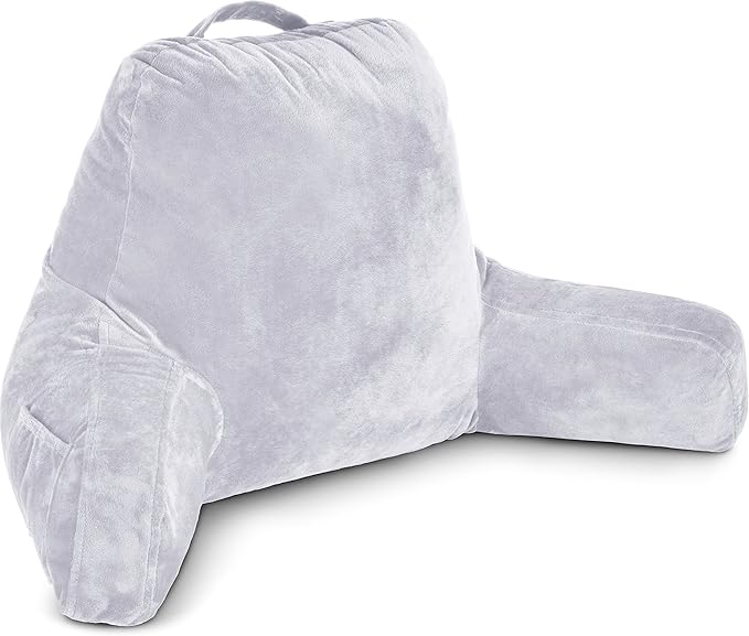 Husband Pillow Light Grey, Original Reading Pillow in Bed Rest Chair, Shredded Memory Foam Large Lounge Cushion Adult Backrest with Arms, Comfy Back Support for Sit Sitting Up, Wash/Removable Cover