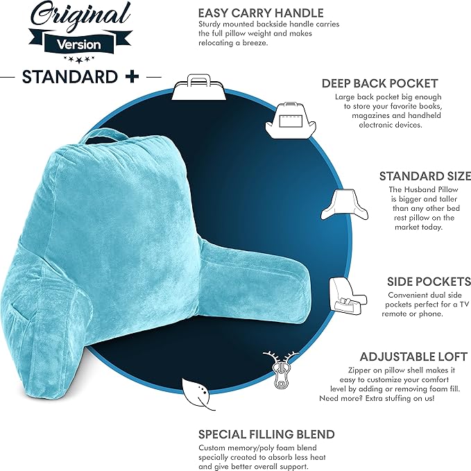 Husband Pillow Carolina Blue, Original Reading Pillow in Bed Rest Chair, Shredded Memory Foam Large Lounge Cushion Adult Backrest with Arms, Comfy Back Support, Sit Sitting Up, Wash/Removable Cover