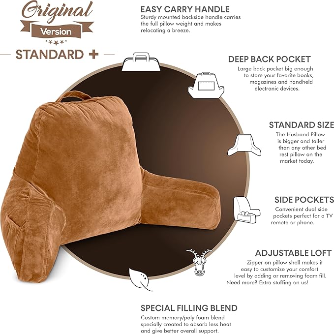 - Comfort Guarantee: The superior quality and workmanship of the husband pillow is backed by our promised to resolve all issues . This pillow is taller and wider than the leading backrest pillows available, measuring a generous 18 inches in height. In addition, we sell extra covers, should you ever want to change colors or replace the cover.