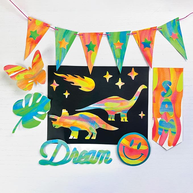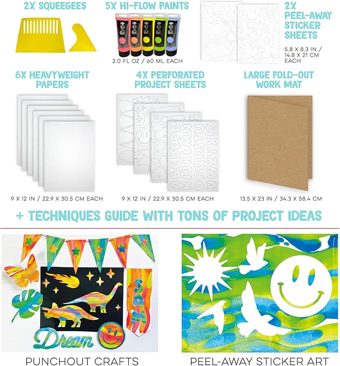 - INCLUDED IN THE KIDS CRAFT KIT - The art kits for kids comes with 2 squeegees, 5 hi-flow neon paints, 6 sheets of thick paper, 4 punch-out sheets, 2 peel-away sticker sheets and a large fold-out work surface