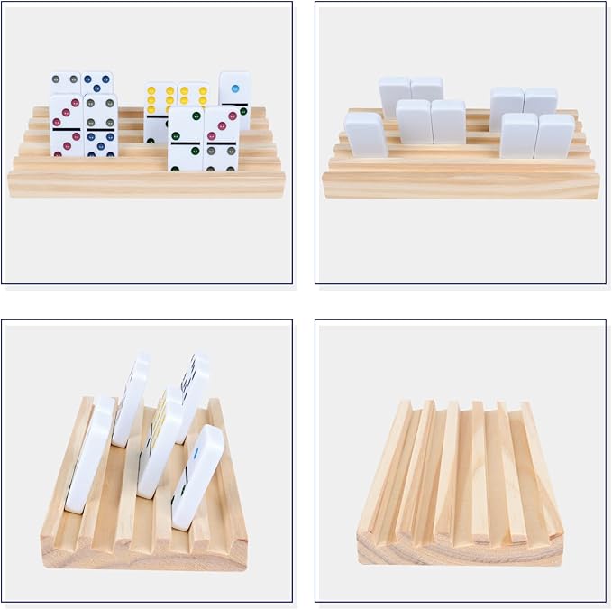 - 【UNIQUE DESIGN AND WIDE USAGE】Each tray has 5 slightly slanted slots, great for dominoes standing upright or sideways in the racks.And it’s perfect for Mexican Train and other domino games!Soft felt is at the bottom of the wooden tray, which can protect your table,prevent the tray from slipping and reduce noise.