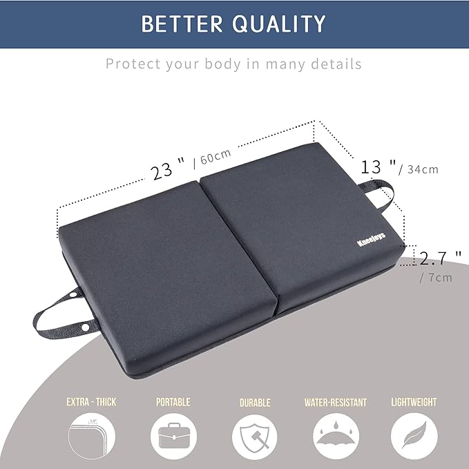 - EXTRA THICK kneeling pad: The garden pads for kneeling is 12" x 13.5" x 5.5" (folded) and 24" x 13.5" x 2.7" (open) , Dual-layer foam bring your knees the comfortable and perfect support as kneeling pad for gardening, kneeling pad for bathing , knee pad for working out.