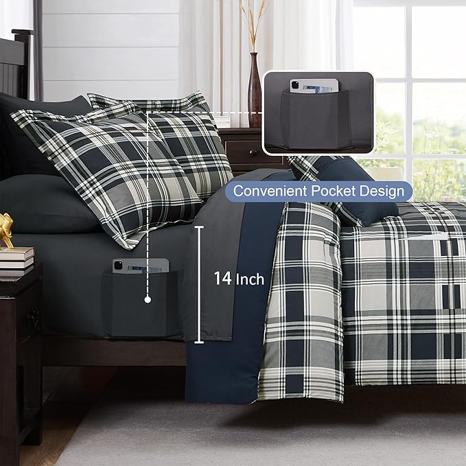 - Plaid Design: Upgrade your bedroom decoration with our plaid comforter set full size, endows it with classic nobleness and coziness. Fitted sheet is designed with a storage pocket, which is convenient and practical.(NO DECO PILLOW)