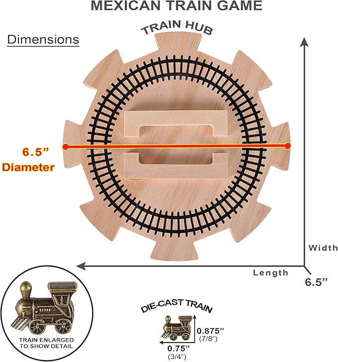 - Quality Mexican Train dominoes set with wooden train hub and 8 die-cast metal Mexican Train markers.