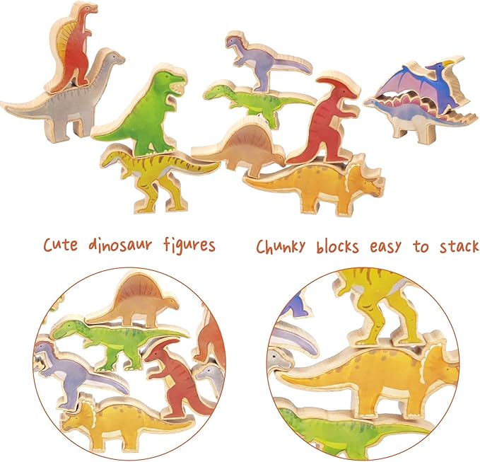 Xylolin Wooden Dinosaur Blocks Stacking and Balancing Toys, Toddler Wood Dinosaur Figures Blocks Imaginative Play, Preschool Educational Toys Gifts and Stack Balance Games for Kids