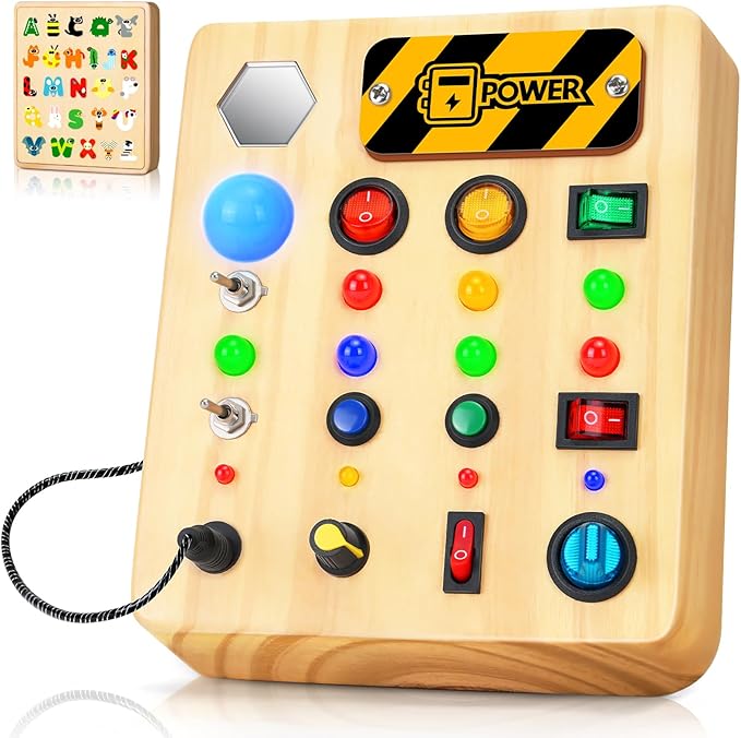 LED Busy Board, Wooden Sensory Toys for Toddler, Montessori Music Toy for Airplane, Travel Activity Educational Learning Toy, Busy Light Switch Autism Toys, Birthday Boys Girls Gifts