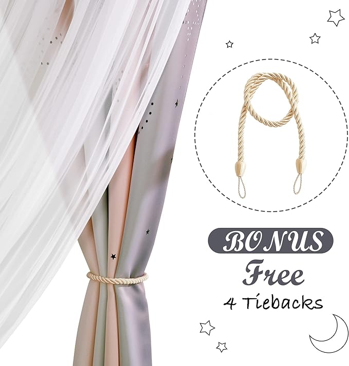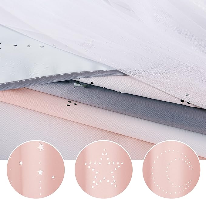 - Hollow Star: Hollow stars design cuts the light entering the room into the star shapes. The stars twinkle with the changing light throughout the day. This special airy sheer design will create a more dreamy sense for your little kids' room.