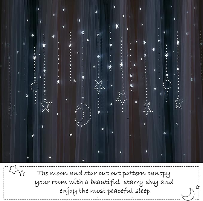 - Hollow Star: Hollow stars design cuts the light entering the room into the star shapes. The stars twinkle with the changing light throughout the day. This special airy sheer design will create a more dreamy sense for your little kids' room.