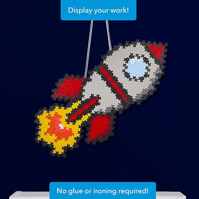 - BUILDING SET INCLUDES: This colorful Rocket set includes 500 pieces and a numbered pattern flyer to build on. When you are done, display it on a table or hang it up as room decor - no glue or ironing required! Each block piece measures 3/4" x 1/2".