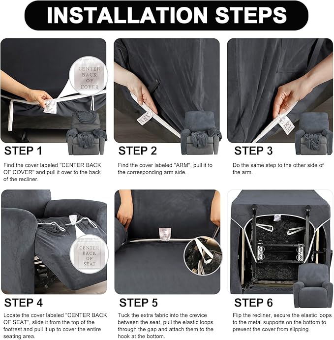 - Stay in Place: Durable elastic hem is well-sewn at the bottom of the recliner cover, making it holds the seat tight. Thick elastic loops can be hooked and secured under the footrest or metal bracket at the bottom, which can prevent slipping. The separated design helps every part of the furniture stays tighter while reflecting the original shape, recommended for both leather and cloth furniture.