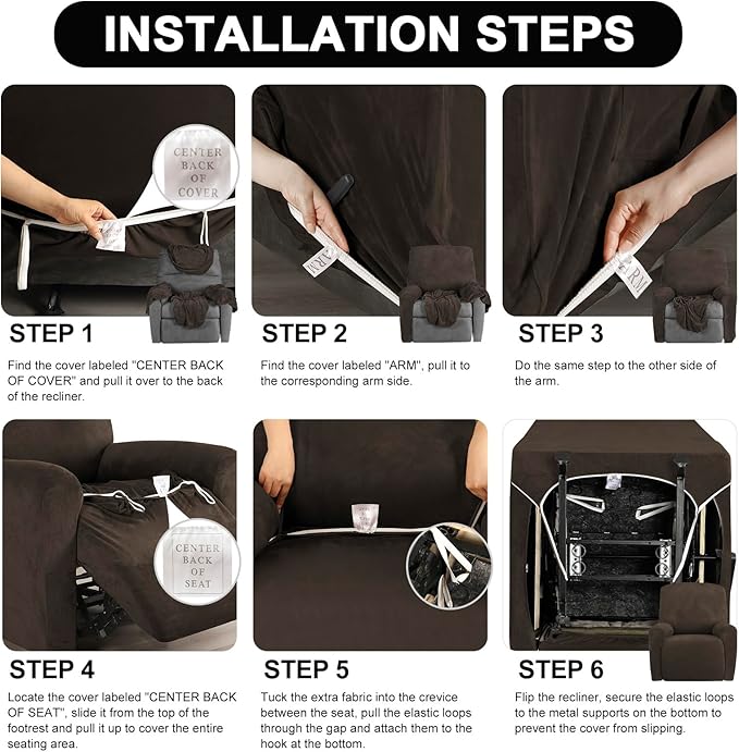 - Stay in Place: Durable elastic hem is well-sewn at the bottom of the recliner cover, making it holds the seat tight. Thick elastic loops can be hooked and secured under the footrest or metal bracket at the bottom, which can prevent slipping. The separated design helps every part of the furniture stays tighter while reflecting the original shape, recommended for both leather and cloth furniture.