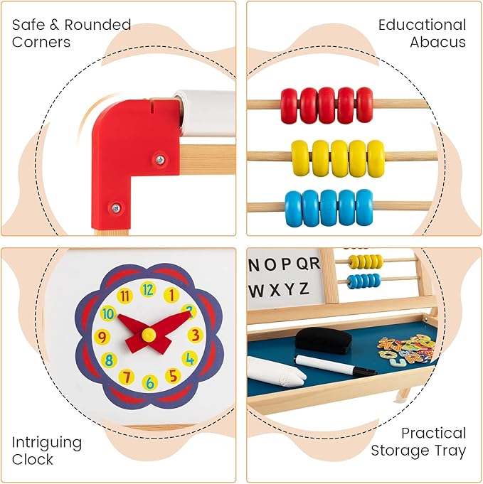 - 【Ideal Gift for Early Education】The toddler wooden easel includes multiple educational areas, such as the abacus, clock and alphabet, which is conducive to early education. These learning areas will cultivate children’s cognition of math, English and art. Likewise, the cute clock helps kids develop the notion of time.