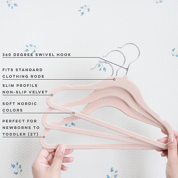 - ⭐️ 𝗦𝗧𝗬𝗟𝗜𝗦𝗛 𝗦𝗣𝗔𝗖𝗘 𝗦𝗔𝗩𝗘𝗥: Maximize closet space with the slim profile of 3 Sprouts Velvet Kids & Toddler Hangers, designed for easy organization and quick access to your little one's clothes; available in soft & modern nordic colors to effortlessly blend with your nursery décor, these hangers bring both style and functionality to reflect your baby's calm, gentle environment.