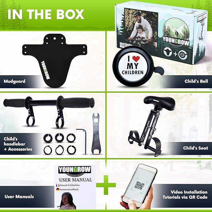 - 🛡️【The Mudguard】- Equip your mountain bike with our front mudguard for a cleaner, more comfortable, and safer ride with your child. It protects against dirt, rocks, and debris encountered during the activity, while also preventing splashes on clothing and faces. This accessory is easy to install and essential for all mountain biking outings with your child.