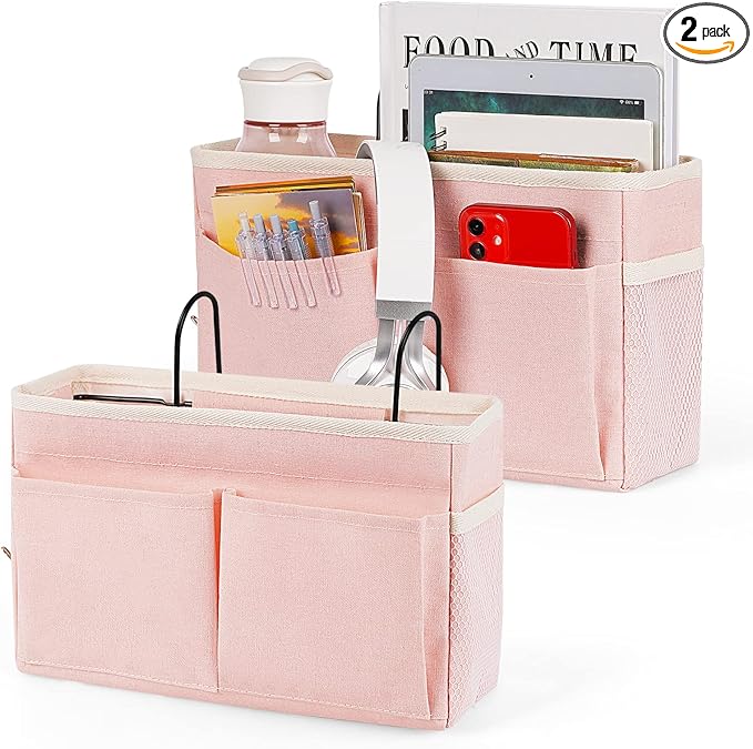 Bedside Caddy Bedside Storage Organizer Hanging Bunk Bed Dorm Room with Side Pockets for Water Bottles, Books, Cell Phones, Headphones 2 Pack (Pink)