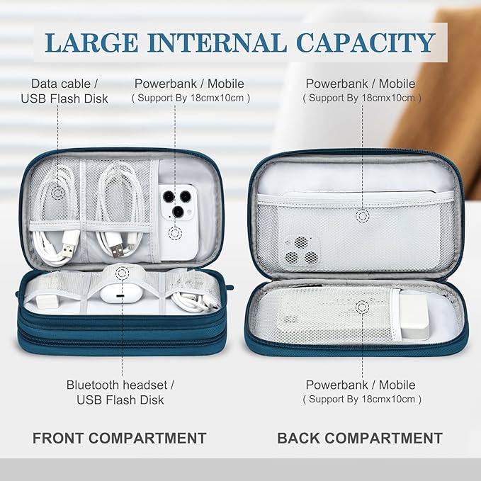 - Double Layers Design: The electronics storage bag has 2 layers interior compartment with enough space to take in your cords, cables, USB drive, cellphone, charger, mouse, flash drive, and other accessories.