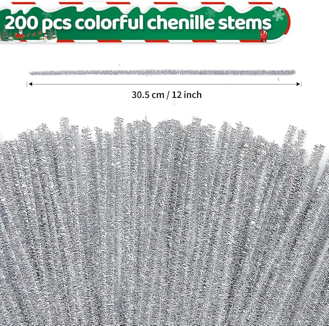 - You Will Get: 200 pieces of glitter silver chenille stems,exquisitely packaged. L×W×H:12*3*1 in. Available in a variety of colors, our pipe cleaners are sure to add a touch of whimsy to any project and create something that brings vitality to your life