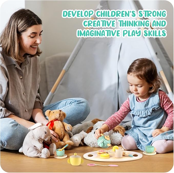 - PERFECT WOODEN TOYS: Our tea party play set is a great way for children to enjoy afternoon tea party time with family or friends. It also promotes kids social skills, emotional skills and motor skills; enhance imagination and creativity in conversation.