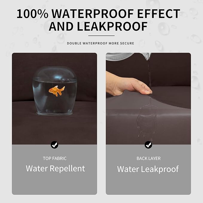 - 100% Waterproof Fabric: Top Fabric is processed with waterproof treatment, and back coated with waterproof layer. Dual waterproof feature can guarantee 100% waterproof effect and leakproof. elastane +polyester, back coated with TPU film. The couch cover is a great choice for homes with children and pets.
