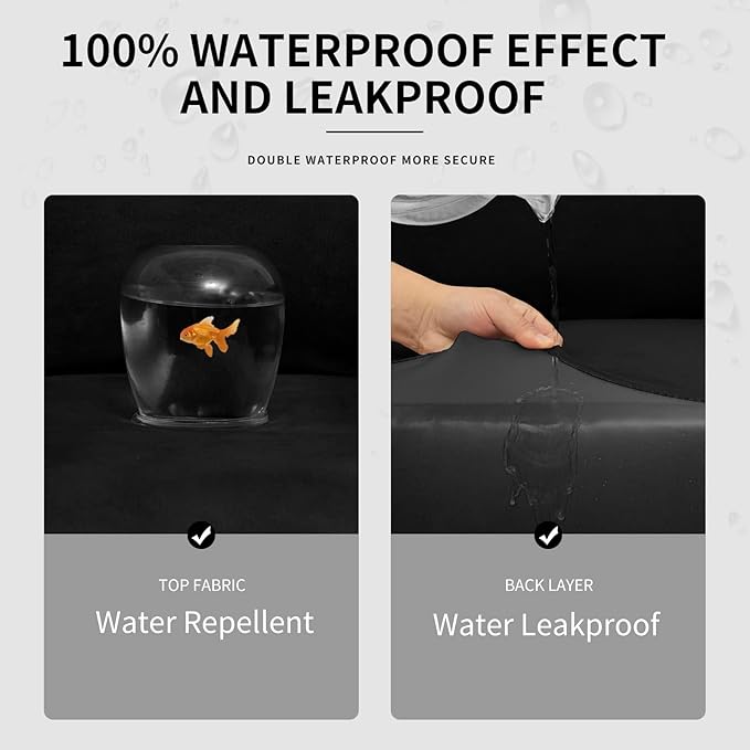 - 100% Waterproof Fabric: Top Fabric is processed with waterproof treatment, and back coated with waterproof layer. Dual waterproof feature can guarantee 100% waterproof effect and leakproof. elastane +polyester, back coated with TPU film. The couch cover is a great choice for homes with children and pets.