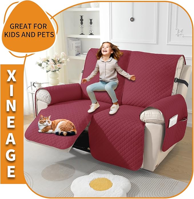 XINEAGE Water Resistant Recliner Cover, 2 seat Recliner Loveseat Covers with Pockets, Quilted Thick Recliner Protector Cover for Dog Pets with Non Slip Backing and Strap (Recliner Loveseat, Red)
