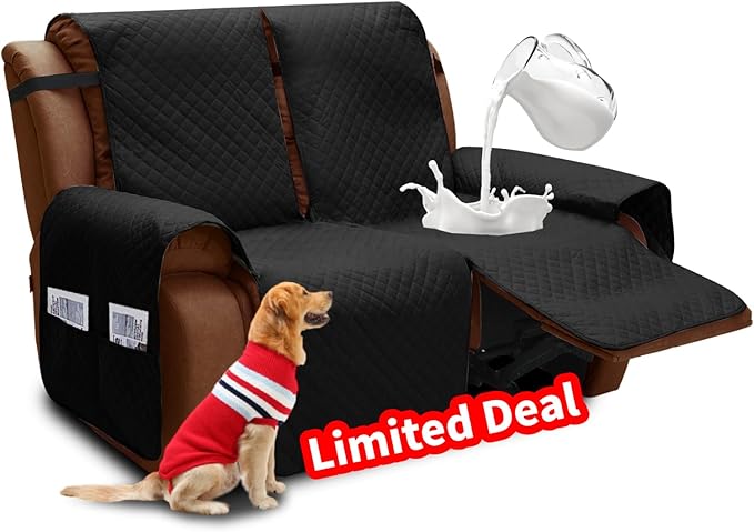 XINEAGE Water Resistant Recliner Cover, 2 seat Recliner Loveseat Covers with Pockets, Quilted Thick Recliner Protector Cover for Dog Pets with Non Slip Backing and Strap (Recliner Loveseat, Black)