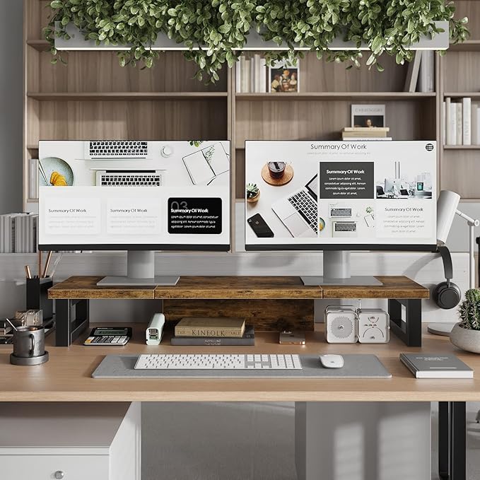 - 【Monitor Stand for 2 Monitors】This stand is an ideal choice when you need computers to work together. Unique original design,patented products,this dual-monitor stand features a sturdy construction black with a rustic brown wood finish for an added rustic and unique look.